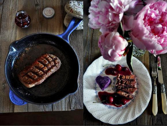 Magret de canard aux griottines, purée de patate douce mauve