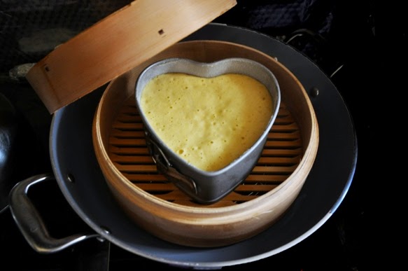 Faire cuire à la vapeur, au dessus de l’eau frémissante dans un wok ou une grande casserole. Faire cuire 30 minutes jusqu’à ce qu’un pic en bois inséré au centre ressorte propre.